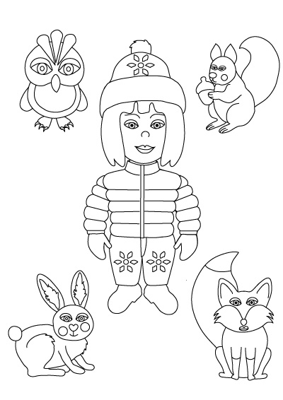 Ala idąc na spacer nie zapomina, żeby ciepło się ubrać. Na kolorowankach Ala ma ciepłe czapki i wtula się w ciepłe kaptury.
